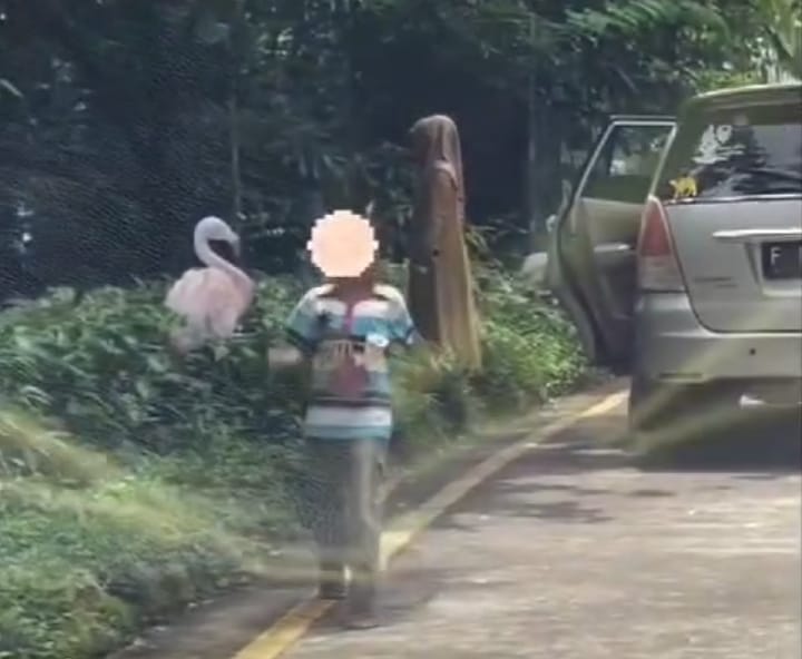 Dalam video yang beredar luas di media sosial, salah satunya di akun Instagram @bangonim, terlihat beberapa orang pengunjung yang sepertinya satu keluarga turun dari kendaraannya dan menghampiri satwa.