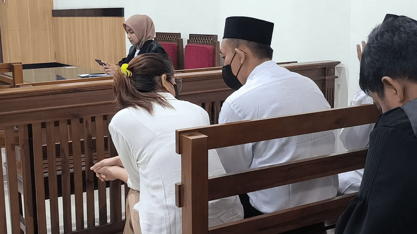 Di dalam ruang persidangan, IBP tampak mengenakan kemeja putih, celana hitam, dan peci, sementara VK tampil mengenakan blus putih dan celana krem. Keduanya datang bersama tahanan lain, dikawal oleh petugas kejaksaan, dan duduk berdampingan di kursi terdakwa.