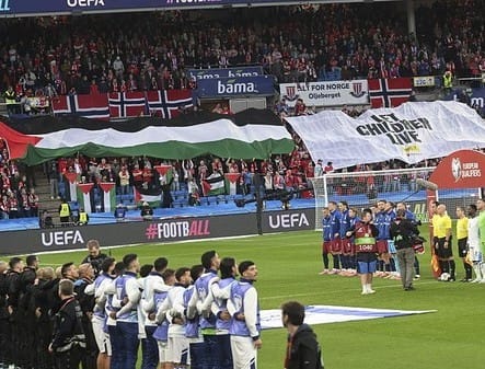 Fans Norwegia memasukkan bendera Palestina berukuran besar dan mengibarkannya di dalam tribun Ullevaal Stadium. Di sebelah bendera terpampang spanduk putih bertuliskan ‘Let Children Live’ (biarkan anak-anak hidup).