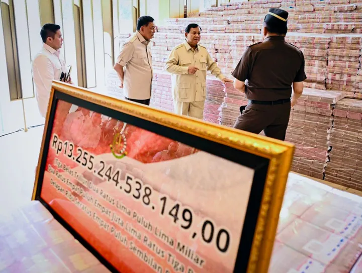 Prabowo tampak berdiri di samping Jaksa Agung dan Menteri Keuangan saat proses penyerahan uang. Prabowo lantas bertepuk tangan dan tersenyum saat tumpukan uang itu resmi diserahkan kepada negara.