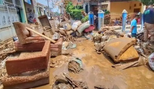 Setelah banjir surut, akses jalan utama di kawasan tersebut kembali bisa dilalui kendaraan. Namun, lapisan lumpur tebal dan tumpukan barang rongsokan dalam karung masih menutupi sejumlah titik permukiman.