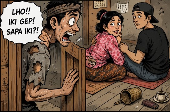 Sementara Bendot sibuk membajak sawah, rumahnya justru “dibajak” dengan metode yang jauh lebih halus tapi menghancurkan.